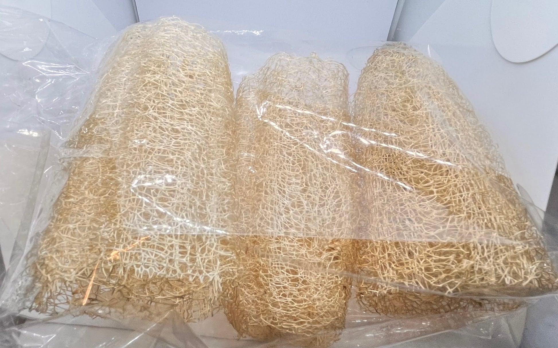 Three (3) prepackaged cut 5 inch loofahs. Easily cut with a knife or scissors to desired length.