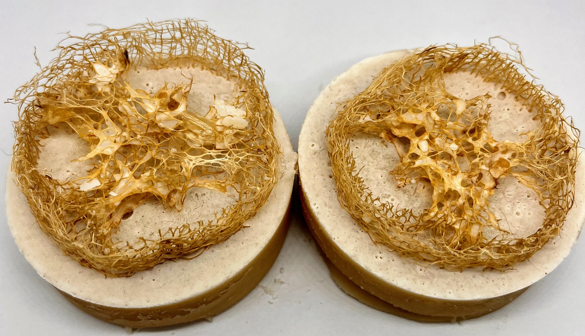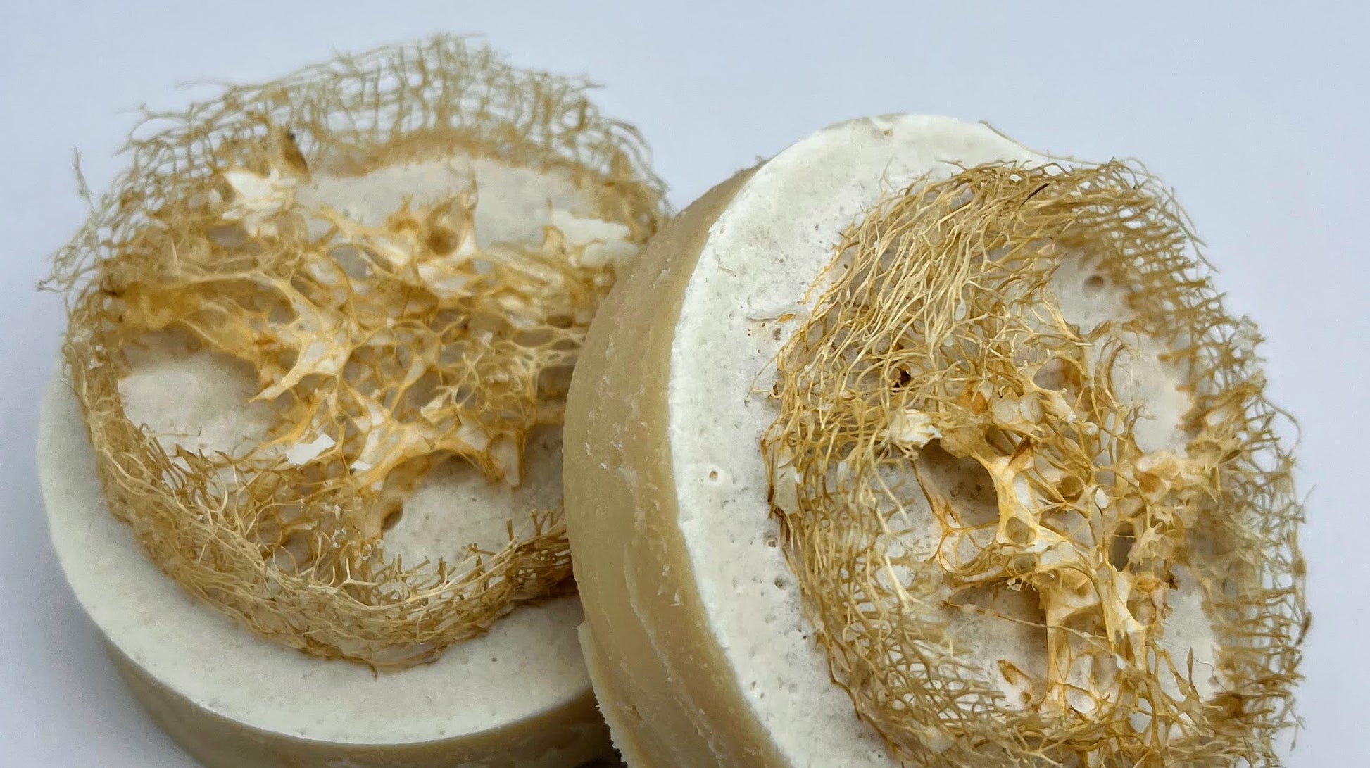 Round hand soap with embedded loofah! This is a Honey Almond handmade goats milk soap that leaves you feeling clean and moisturized. Perfect for every day use. Scented with real local honey and honey almond essential oil.